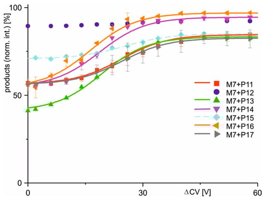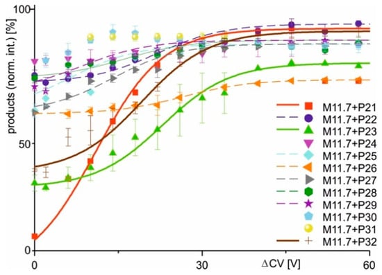 | Complex (a) | Peptide Sequence | Mean Charge ± SD. (b,c) | Initial (%) (b,c,d) | Final (%) (b,c,e) | Δ (% pts) | ΔCV50 (V) (b) | dx (V) (b) | Slope (%/V) (b) | R2 (b,c) |