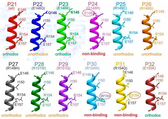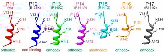 - Hoffmüller, U.; Knaute, T.; Hahn, M.; Höhne, W.; Schneider-Mergener, J.; Kramer, A. Evolutionary transition pathways for changing peptide ligand specificity and structure. Embo J. 2000, 19, 4866–4874. [Google Scholar] [CrossRef] [PubMed][Green Version]