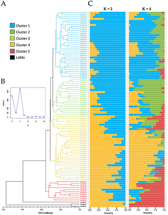 Genetic similarity (GS) and genetic structure analysis results based on the molecular profiles of 93 L. camara (LaCaBL#) and 3 L. montevidensis (LaMoBL#) clonal lines obtained with 14,039 SNPs via a ddRADseq approach. (A). Unweighted pair group method with arithmetic mean (UPGMA) dendrogram based on GS analysis performed with the simple matching (SM) coefficient. Different colours represent the highlighted clusters. (B). Genetic structure putative ancestor number (K) likelihood (C). Graphic representation of the genetic structure analysis considering K = 2 and K = 4. Different colours represent different putative ancestors.