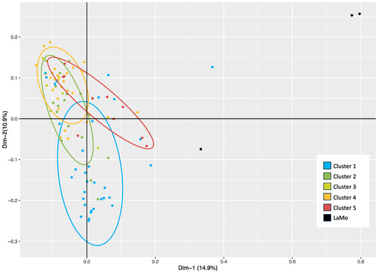 An unweighted pair group method with arithmetic mean (UPGMA) dendrogram based on the GS analysis highlighted five different clusters (Figure 1A).