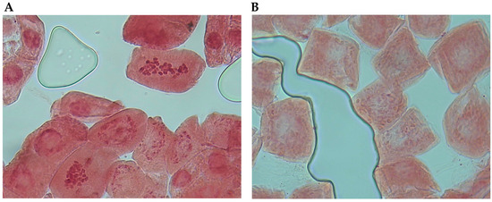 Chromosome counting was carried out by treating fresh root tips as described in the Feulgen staining procedure [95]. In particular, the following protocol was used: pretreatment with 0.4% colchicine for 3 h, fixation in Carnoy solution for 1 h, hydrolysis in 1 N HCl at 60 °C for 8 min, and staining with leuco–basic fuchsine for 2 h. Subsequently, the root tips were squashed in an aceto-orcein solution on microscope slides, and chromosomes were observed with a Leitz Diaplan optical microscope (Leica Microsystems, Wetzlar, Germany) at 100× magnification. Images were taken with Leica LAS–EZ 3.0 imaging software (Leica Microsystems) changing the microscope focus for chromosome counts in different space levels. At least four clearly observable metaphase plates per BL were counted.