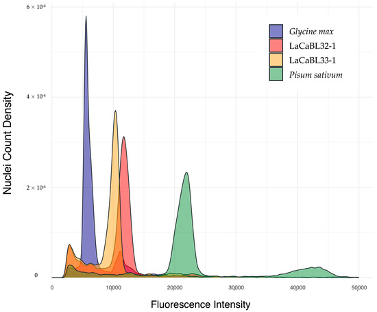Overlay histogram of the fluorescence intensity in relation to the nuclei count kernel density estimation relative to a flow cytometry analysis for the genome size estimation of Lantana camara L. triploid (LaCaBL33-1) and tetraploid (LaCaBL32-1) breeding clonal lines, Glycine max Merr. cv. “Polanka” (2C DNA content: 2.50 pg) and Pisum sativum L. cv. “Ctirad” (2C DNA content: 9.09 pg) [58].