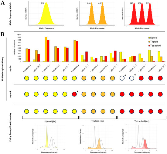 (A). Models of SNP distribution per allelic frequency for diploid, triploid and tetraploid organisms. (B). Likelihood of deviation from the models of the SNP distributions retrieved through the nQuire framework and ploidy predictions obtained through the nQuack framework from ddRADseq SNP profiles of 15 L. camara L. clonal lines in comparison with ploidy data derived from flow cytometry. *: lines for which the prediction did not match the flow cytometry results.