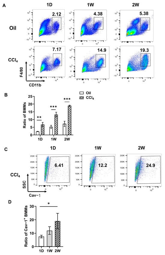To elucidate the pathophysiological role of bone marrow-derived macrophages (BMMs) in acute hepatic injury, we established a carbon tetrachloride (CCl4)-induced liver damage model in male C57BL/6J mice. Animals received intraperitoneal injections of 10% (v/v) CCl4 solution twice weekly. Hepatic non-parenchymal cells were harvested at precisely defined intervals (1D, 1W, and 2W) post-injection for comprehensive immunophenotyping. Flow cytometric analysis revealed stable BMMs populations (F4/80+CD11b+) in vehicle control (oil-treated) mice across all timepoints (2.12% at 1D, 4.38% at 1W, 5.38% at 2W). Strikingly, Cav-1-deficient mice exhibited progressive BMMs expansion following CCl4 exposure, with percentages escalating from 7.17% (1D) to 14.90% (1W) and 19.30% (2W) (Figure 1A,B, ** p < 0.05 or *** p < 0.001 vs. control; detailed gating strategy in Supplementary Figure S1A).