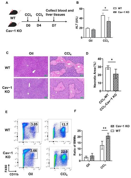 Liver necrotic lesions are a common pathological feature observed in various human hepatic disorders. However, the cellular mechanisms underlying necrotic lesion resolution remain complex and exhibit heterogeneity across different etiologies of acute liver injury. Emerging evidence highlights bone marrow-derived macrophages (BMMs) as critical mediators in resolving necrotic lesions during liver injury [,]. Caveolin-1 (Cav-1), the principal structural component of plasma membrane caveolae, functions as a signaling hub through interactions with diverse signaling molecules []. In this study, we demonstrated elevated BMMs recruitment coupled with upregulated Cav-1 expression in CCl4-induced acute liver injury. Genetic ablation of Cav-1 enhanced BMMs infiltration while mitigating hepatocellular necrosis. Mechanistically, Cav-1 was identified as a pivotal regulator orchestrating both BMMs activation and recruitment. In vitro experiments revealed that Cav-1 knockout (KO) potentiated BMMs migratory capacity and promoted M2 polarization. Notably, the adoptive transfer of Cav-1-deficient BMMs ameliorated hepatocyte necrosis and apoptosis, concomitant with augmented BMMs recruitment and downregulated CXCL-9/10 expression. These findings collectively establish Cav-1 as a master regulator of BMMs dynamics during necrotic lesion resolution in acute liver injury.