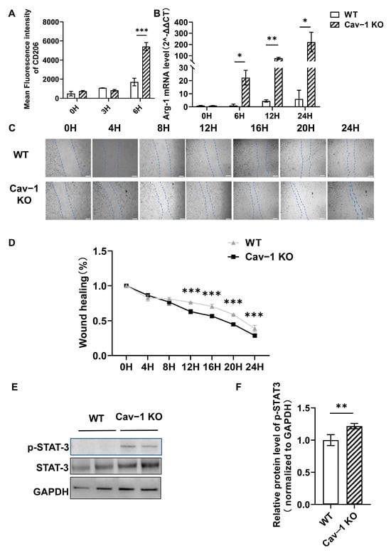 The deficiency of Cav-1 significantly augmented M2-like polarization and the migratory capacity of BMMs in vitro. (A) CD206+ macrophage quantification by flow cytometry at 0, 3, and 6 h post IL-4 stimulation (20 ng/mL). (B) Time-course Arg-1 mRNA expression in IL-4-treated BMMs (0–24 h). (C) Scratch wound healing assay of mature WT/Cav-1 KO BMMs (8 × 105 cells/well) in serum-free medium. Dashed lines demarcate wound edges at indicated timepoints (0–24 h). Scale bar = 100 μm. (D) Wound closure rate quantification (remaining wound area/original area). (E) Representative Western blot of p-STAT3, total STAT3, and GAPDH. (F) Densitometric analysis of p-STAT3/GAPDH ratio. Data in (A,B,D,F) analyzed by two-way ANOVA (A,B,D) or Student’s t-test (F). Data represent mean ± SD. n = 3. Bar = 100 μm, * p < 0.05, ** p < 0.01, *** p < 0.001 vs. WT controls.