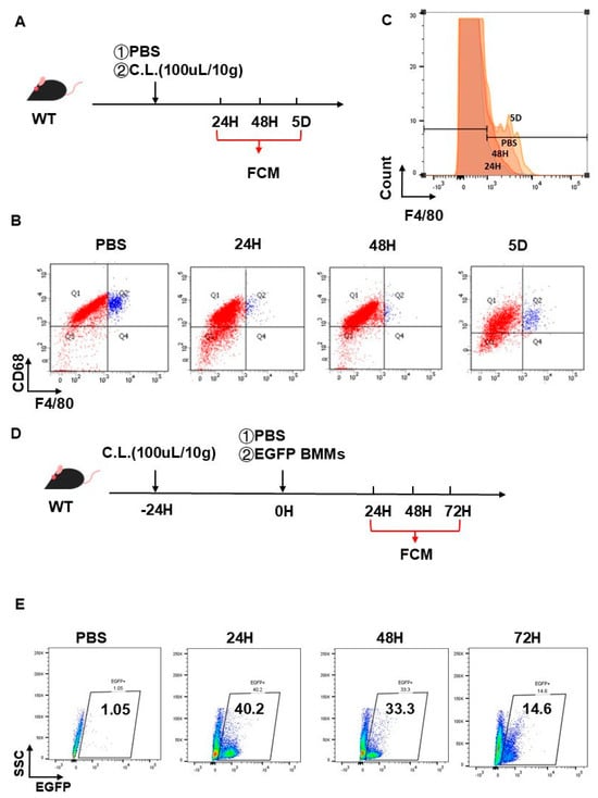Validation of hepatic macrophage depletion followed by adoptive BMMs reconstitution. (A) Flow chart for study design. Resident hepatic macrophages were depleted by administrating clodronate liposomes (CLs). (B) Representative flow cytometry plots for F4/80+ macrophages in livers after CL treatment from 24 h to 5 days. (C) Histogram for efficiency of hepatic macrophage depletion by CLs. (D) Study design flowchart: administration of EGFP+ BMMs into mice after clodronate liposome treatment for 24 h. (E) Representative flow cytometry plots for EGFP+ BMMs in livers after administration from 24 to 72 h.