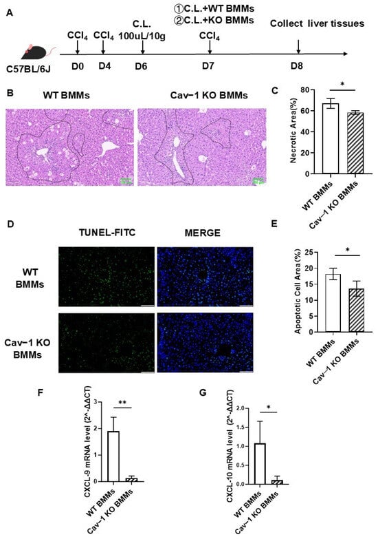Histopathological analysis revealed that Cav-1-deficient BMMs significantly reduced hepatic necrosis (58.45% vs. 67.04% in controls, p = 0.0105; Figure 5B,C) and apoptosis (13.65% vs. 18.24%, p = 0.0127; Figure 5D,E). Concurrently, we observed downregulated chemokine expression—C-X-C motif chemokine ligand 9 (CXCL9, p = 0.0044) and ligand 10 (CXCL10, p = 0.0385) (Figure 5F,G).