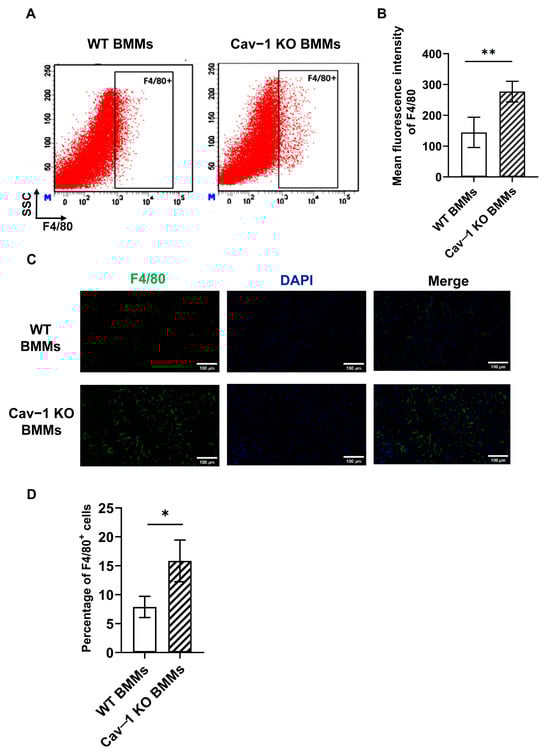 To validate the flow cytometry data and ascertain the spatial distribution of BMMs within the damaged livers, immunofluorescence staining was also performed. As shown in Figure 6C,D, F4/80 positive cells were significantly increased in the damaged livers of Cav-1 KO BMMs-treated animals compared to the WT BMMs control.