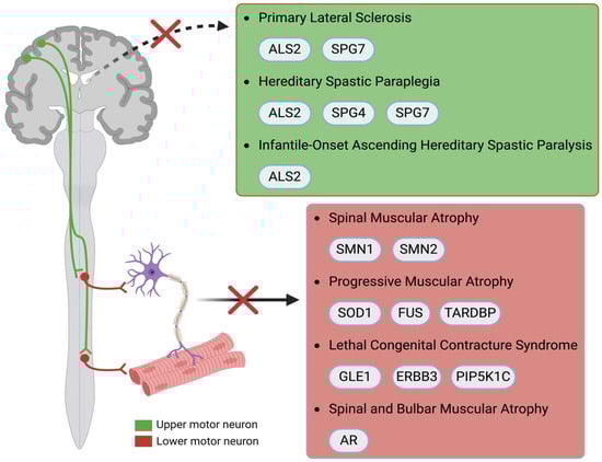 The MND spectrum includes several clinically distinct disorders [3]. The most common are amyotrophic lateral sclerosis (ALS), primary lateral sclerosis (PLS), and spinal muscular atrophy (SMA), each with unique pathophysiology, symptom profiles, and disease progression rates. Additionally, less common but significant forms include infantile-onset ascending hereditary spastic paralysis (IAHSP), hereditary spastic paraplegia (HSP), progressive muscular atrophy (PMA), spinal and bulbar muscular atrophy (SBMA)—also known as Kennedy’s disease—and lethal congenital contracture syndrome (LCCS). These conditions collectively constitute the full spectrum of MNDs. Central to the pathology of MNDs are genetic mutations in several key genes, including C9orf72, SOD1, TARDBP, and FUS. These mutations contribute to motor neuron degeneration through mechanisms such as oxidative stress, impaired autophagy, and abnormal RNA metabolism. Specifically, oxidative stress leads to cellular damage, while defects in autophagy result in the accumulation of damaged proteins and organelles, disrupting neuronal homeostasis. Abnormal RNA metabolism further compromises essential cellular functions, exacerbating motor neuron degeneration [1,4,5].