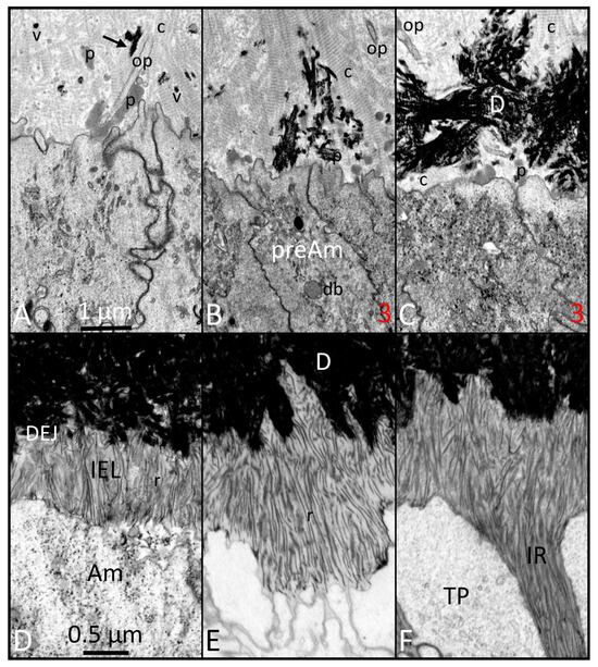 FIB-SEM images of the start of dentin mineralization late in the presecretory stage ((A–C); same magnification): early phases of appositional growth of the enamel layer in the secretory stage ((D–F); same magnification). (A) Initial mineral deposits in the predentin occur as small spherical clusters inside matrix vesicles (vs) or as elongated linear rods (black arrow) between or on the surface of collagen fibers (c). No mineral forms in relation to the protein clusters (p). (B,C) (similar to site 3 in Figure 1): Mineralization spreads rapidly both laterally and vertically. Some areas of the predentin closest to the distal surface of preameloblasts remain mineral-free for a slightly longer time than neighboring areas (db: dense body [lysosome]). (D) As ameloblasts (Ams) move outward away from the DEJ, they leave behind thin mineral ribbons (rs) that appear to be attached at one end to the mineral in dentin. These ribbons are arranged mostly vertically and parallel to each other, and form part of a thin innermost layer called the initial enamel layer (IEL). (E) A differential rate of ribbon lengthening starts to occur at sites down the sides between adjacent Ams, which encases the distal end of the ameloblast to map out a structure called the Tomes process (TP), a cytoplasmic structure responsible for forming the enamel rods. (F) The lateral extensions of mineral ribbons from the IEL are called enamel prongs and form territories of enamel mineral that are called interrod (IR) enamel. This figure, containing images with improved resolution, was first published in Smith et al., 2016 [1].