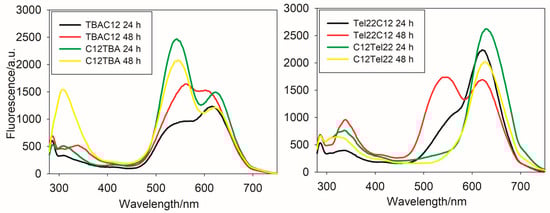 Figure S3 shows their emission spectra in Tris-acetate (TRIS) buffer. The emission spectrum of TBAC12-AgNCs in TRIS exhibits maximum fluorescence at lower wavelengths than C12TBA-AgNCs. The emission spectrum of C12TBA-AgNCs in PBS or TRIS displays two distinct peaks, with maxima at 570 nm and 620 nm. Moreover, there are temporal changes observed in the fluorescence behavior of C12TBA-AgNCs. After 48 h in TRIS, the intensity of the peak at 570 nm slightly increases, whereas the emission at 620 nm clearly decreases. These changes might be attributed to structural modifications or interactions occurring within the nanocluster–DNA complex over time.
