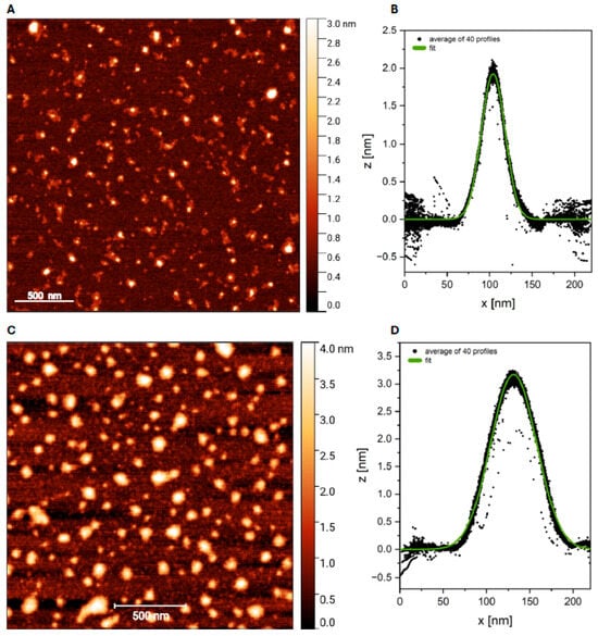 n = 40), the dimensions of both investigated systems were determined, and the following values were obtained: C12TBA-AgNCs: 1.92 ± 0.15 nm and C12Tel22-AgNCs: 3.18 ± 0.17 nm. The second sample not only exhibits significantly larger dimensions but also appears to be more diverse in terms of its size and shape.