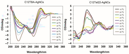 The CD spectra of C12TBA-AgNCs and C12Tel22-AgNCs were taken from 10 °C onwards for the investigation of the temperature-dependent conformational behavior of the DNA-templated silver nanoclusters (