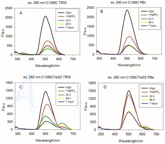 Figure 4). This emission can be directly excited at 575 nm, and in that case, it comes exclusively from nanoclusters. Moreover, the obtained emission spectra indicated that the strong fluorescence of C126tC as well as of C126tCTel22 coming from excited tC is red-shifted and quenched by the addition of Ag