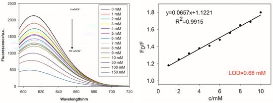 + ion concentration. Based on the emission spectra, we constructed a Stern–Volmer plot, which illustrates the quenching effect of K