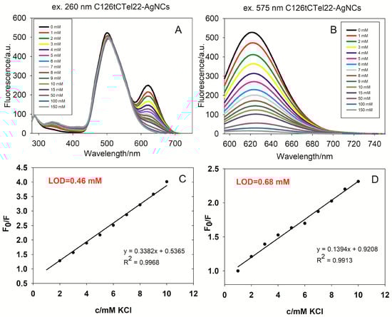 Figure 6 show the behavior of C126tCTel22 silver nanoclusters (AgNCs) during titration with increasing concentrations of potassium chloride (KCl) in TRIS buffer. The first spectrum (A) shows the fluorescence intensity over a wavelength range from 300 nm to 750 nm, with excitation at 260 nm. There are two main fluorescence peaks observed: a prominent one around 500 nm and a secondary one around 630 nm. As the concentration of KCl increases (from 0 mM to 150 mM), only the intensity of the fluorescence peak at 630 nm changes notably. The second panel (B) displays the fluorescence intensity, focused on the 600–740 nm region, with excitation at 575 nm. As expected, a single fluorescence peak is observed around 630 nm, at which the fluorescence intensity decreases consistently with increasing KCl concentrations. The corresponding excitation spectra are shown in