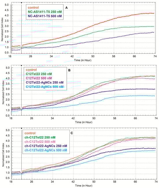 Figure 8A, green) and 500 nM (blue) significantly reduced the Cell Index values, demonstrating a dose-dependent antiproliferative effect. The free C12Tel22, especially at lower doses, did not affect the change in proliferation (