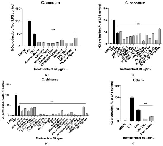 Effects of total extracts of pepper cultivars including (a) C. annuum, (b) C. baccatum, (c) C. chinense, and (d) C. frutescens and C. pubescens on nitric oxide production in activated macrophages. Cells were treated with target samples at 50 µg/mL and the inflammatory response was induced with 1 µg/mL LPS for 6 h (n = 3). The assay was validated with 10 µM dexamethasone as a reference control. Changes in nitrite concentration as an indirect measure of nitric oxide production were reported as mean ± SEM relative to the LPS controls (*** p < 0.001).