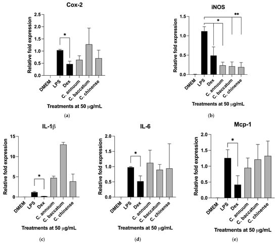 Inflammatory gene expression profiles in the LPS-activated macrophages focusing on (a) cyclooxygenase-2 (COX-2), (b) inducible nitric oxide synthase (iNOS), (c) interleukin 1β (IL-1β), (d) interleukin 6 (IL-6), and (e) monocyte chemoattractant protein-1 (MCP-1) in duplicate (n = 2). The assay was validated with 10 µM dexamethasone as a reference control. Data were reported as mean ± SEM and analyzed by ANOVA followed by Dunnett multiple comparisons test. Fold changes in gene expression are reported as means relative to the LPS-induced control (* p < 0.05, ** p < 0.01).