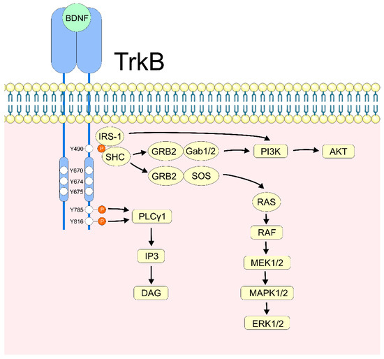 The mature BDNF homodimer dimerizes the TrkB receptor and activates intracellular kinase domains via a cysteine knot motif. Receptor activation is modulated by tyrosine phosphorylation—of Y670, Y674, and Y675—in TrkB’s cytoplasmic domains (Figure 2). Tyrosine residues Y490 and Y785 activate downstream signaling by interacting with adaptor proteins with phosphotyrosine-binding (PTB) or src-homology-2 (SH-2) motifs [16,65]. Phosphorylation on residues Y785 or Y816 activates the PLCγ/DAG/IP3 signaling pathway, while pY490 recruits and phosphorylates Shc, activating the Grb2/SOS complex and Ras/Raf/MEK/ERK pathways or the Grb2/Gab1/2 complex and the PI3K/Akt pathway [66,67]. PI3K signaling can also be activated directly by pY490 binding IRS-1 [16] (Figure 2).