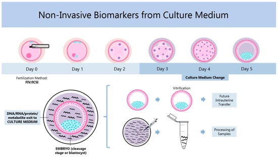 Schematic representation showing the timing of biological material sampling and processing for “omics” analyses. Between day 3 and day 5 post fertilization (depending on the type of test), samples of spent media from embryo culture containing embryo-derived DNA, RNA, protein, and metabolites are analyzed to select the best embryos for later embryo transfer or cryopreservation (vitrification).