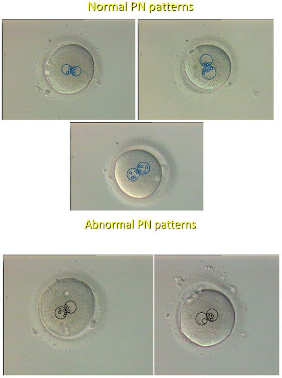 Recently, it was attempted to enhance the predictive power of criteria based on static morphologic evaluation of embryo images by using artificial intelligence (machine learning) to create virtual 3-dimensional (3D) images from time-lapse recordings (time-lapse 3D holotomography), and impressive performance metrics with regard to blastocyst development were reported []. However, a pilot randomized controlled trial (RCT) failed to detect any significant difference in a multicenter, randomized, double-blind noninferiority parallel-group trial conducted across 14 IVF clinics in Europe and Australia, assessing the value of deep learning in selecting the optimal embryo for transfer; it was not able to demonstrate noninferiority of deep learning for clinical pregnancy rate when compared to standard morphology evaluation []. This conclusion was confirmed by another independent RCT []. Consequently, despite being promising, the time-lapse technology still needs to be perfected, possibly by incorporating PN morphology scoring (Figure 2), which was previously shown to have a high predictive potential for further embryo development, embryo ploidy, and IVF outcome [,]. Even so, time-lapse is evidently more rapid and embryo-friendly than the observer-operated grading since it avoids prolonged periods of stay of embryos outside the incubator. In addition to morphology, the spatiotemporal organization of the first mitotic division, analyzed with the use of a unique time-lapse dataset, was shown to predict pregnancy after embryo transfer and to be related to the zygote PN pattern [].