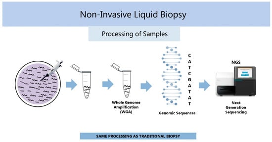 niPGT-A, a kind of noninvasive liquid biopsy used in other fields of medicine (Figure 3), was reported to exhibit high sensitivity, specificity, positive predictive value, and negative predictive value, with low false-positive and false-negative rates, comparing favorably to classical PGT-A in terms of ploidy diagnostic accuracy []. Recently, niPGT-A was successfully used in a single-embryo transfer setting to select euploid embryos in patients carrying balanced chromosomal rearrangements by using genome-wide single nucleotide polymorphism genotyping and haplotyping approach [], and algorithms for minimizing the impact of media contamination with maternal DNA were developed and validated []. In spite of these encouraging findings, the classical PGT-A, performed on whole surplus IVF embryos donated for research, still remains a gold standard for validation of new noninvasive biomarkers. In parallel to PGT-A and niPGT-A, there is growing interest in using morphokinetic embryo analysis (see Section 2.1), alone or in combination with other embryonic and patient parameters, to replace both of them. Notably, the development of a noninvasive artificial intelligence approach for the prediction of human blastocyst ploidy, based on embryo morphology, morphokinetics, and associated clinical information, was reported recently [].