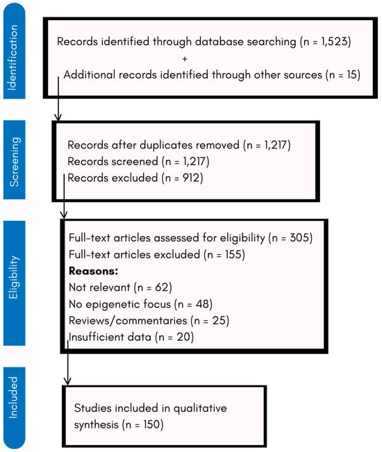A comprehensive literature search was conducted using databases such as PubMed, Scopus, Web of Science, and Google Scholar. The search included studies published between 2000 and 2024, ensuring a broad coverage of both foundational and recent advancements in the field. Keywords used in the search included “epigenetic modulation in neurodegeneration”, “HDAC inhibitors”, “DNMT inhibitors”, “epigenetics and Alzheimer’s”, “epigenetic therapy for Parkinson’s”, and “biomarkers in epigenetics”. Boolean operators (AND, OR) were applied to refine search queries and capture relevant studies. As shown in Figure 1, a total of 1538 records were initially identified. After removing duplicates and applying inclusion/exclusion criteria, 150 studies were included in the final qualitative synthesis.