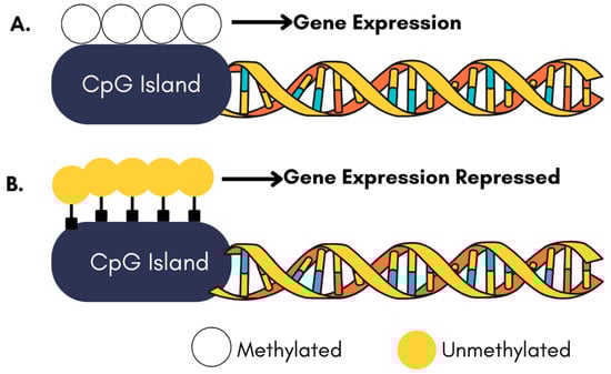 The Influence of DNA methylation on gene expression. (A). An unmethylated CpG island (represented by white circles). In the absence of methylation, transcription proceeds unimpeded, resulting in active gene expression. (B). A gene with a methylated CpG island (represented by yellow circles) within its promoter region. This methylation event prevents the initiation of transcription, leading from the gene. Consequently, gene expressions are repressed.