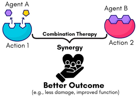 A simplified illustration of combination therapy for NDDs. Two therapeutic agents (“Agent A” and “Agent B”) with their respective mechanisms of action (“Action 1” and “Action 2”). These actions converge through synergy, leading to a better overall outcome, such as improved neuronal function or reduced disease progression.