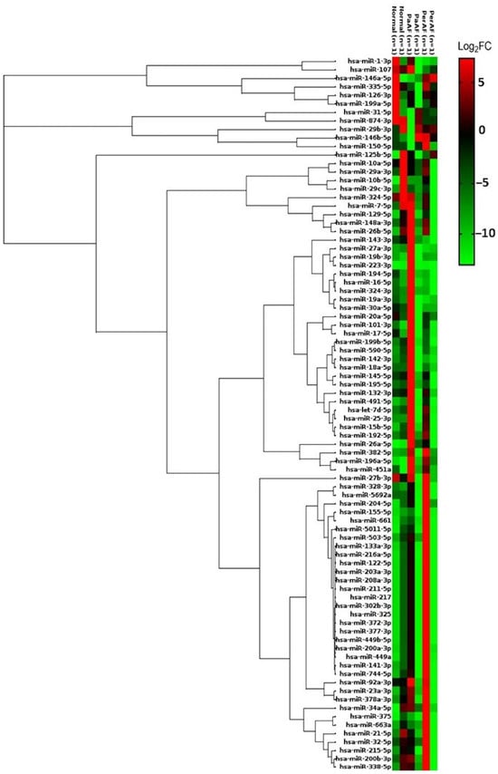 Heatmap of differentially expressed miRNAs in WBCs from patients with AF (PaAF and PerAF) versus no-AF controls. We identified 9 significant miRNAs in PaAF and 12 in PerAF (fold-change ≥1.5 or ≤0.5, or p < 0.05), with 5 overlapping; the heatmap depicts the 16 unique WBC miRNAs dysregulated in at least one AF group. Samples and miRNAs are organized by unsupervised hierarchical clustering, revealing distinct expression patterns by group. Red denotes higher expression and green denotes lower expression relative to the control group. The clustering shows that patients with AF segregate from controls based on WBC miRNA profiles. PaAF and PerAF share several dysregulated miRNAs but also exhibit specific trends—for example, miR-1-3p is consistently downregulated in both AF types, whereas miR-223-3p is upregulated in PaAF but reduced in PerAF. Such patterns indicate that WBC miRNA dysregulation parallels AF severity, with certain miRNAs potentially marking the progression from paroxysmal to PerAF.