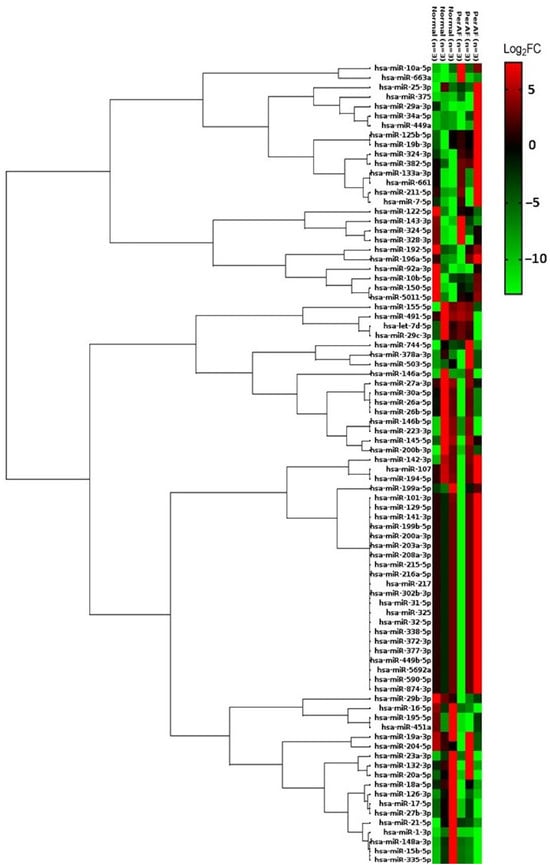Heatmap depicting miRNA expression profiles in plasma samples from patients with PerAF compared with non-AF controls. We identified 47 significantly dysregulated miRNAs in the PerAF group compared with the control group (fold-change ≥1.5 or ≤0.5, or p < 0.05). The dendrogram reflects unsupervised hierarchical clustering of both samples and miRNAs, illustrating grouping by AF status. Expression levels are represented by a red–green color scale: red indicates upregulation (higher expression) and green indicates downregulation (lower expression) relative to the control group. Notably, patients with AF display a broad pattern of miRNA dysregulation in plasma, suggesting that significant circulating miRNA alterations emerge with disease progression.
