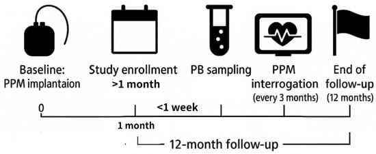 This study involved patients diagnosed with sick sinus syndrome who had permanent pacemaker implantation at our institute from August 2018 to December 2019. Participants with autoimmune disorders, cancers, chronic inflammation, or any documented history of AF were excluded from the control group to minimize potential undetected or subclinical AF. Patients diagnosed with sick sinus syndrome underwent permanent pacemaker (PPM) implantation between August 2018 and December 2019, and were enrolled ≥1 month after implantation to avoid acute post-implantation inflammation. A total of 73 consecutive patients were screened using PPM–Holter monitoring and classified by atrial rhythm burden into persistent AF (n = 15), paroxysmal AF (n = 28), and no AF (n = 30) groups. The exclusion criteria included autoimmune disease, active malignancy, or chronic inflammatory disorders. Plasma samples were pooled by age- and sex-matched groups (three pools per the no AF and PerAF arm), whereas white blood cell (WBC) samples were analyzed individually in age- and sex-matched sets without pooling. Peripheral blood was sampled within 1 week of enrollment, and PPM interrogation was performed every 3 months during a 12-month follow-up to confirm rhythm classification. This workflow is summarized in Figure 3.
