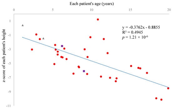 The Z-score of each patient’s height under 20 years showed a significant negative correlation with age. Each dot represents the z-score of height when each patient’s height was first recorded during the study period. Red round dots represent the patients who had received enzyme replacement therapy (ERT). Gray triangular dots represent the patients who had never received ERT. Purple square dots represent patients who had received hematopoietic stem cell transplantation (HSCT).
