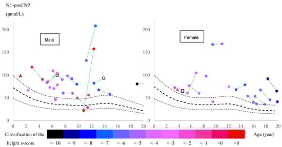 Correlation between age, NT-proCNP, and height of patients with MPS IVA. Males and females are shown in the left and right figures, respectively. Round dots represent patients treated with enzyme replacement therapy (ERT). Triangle markers represent patients who were never treated with ERT. Square markers represent patients treated with hematopoietic stem cell transplantation (HSCT). Filled markers represent patients for whom height at blood sample collection was recorded. Absence of a color indicates that the corresponding height dataset is missing. The color of each marker represents the z-score of each patient’s height calculated based on the CDC growth chart (https://www.cdc.gov/growthcharts/index.htm (accessed on 15 December 2024)). Black dashed lines show median, 5th and 95th percentiles for healthy controls []. When a patient has two data points, each data point is connected by a green dashed line.