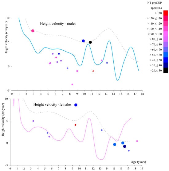 The relationship between each patient’s plasma NT-proCNP level, age, and subsequent height growth rate (height velocity). Height velocity was calculated from two height datasets measured at different times, 7 to 20 months apart. Each dot represents the age of each patient at which the first height was measured (horizontal axis) and the corresponding later height velocity (vertical axis). Round dots represent patients continuously receiving enzyme replacement therapy (ERT) until the second height data were obtained. The square dot represents a patient who had received hematopoietic stem cell transplantation (HSCT) (M08). The triangular dot indicates a patient who never received ERT until his second height data were obtained (M35). Larger round dots represent the attenuated phenotype, while smaller round dots represent the severe phenotype. Each dot is filled with a color corresponding to the plasma NT-proCNP level at the first height measurement. The light blue line shows the 50th percentile for height velocity for male MPS IVA patients, and the pink line shows the 50th percentile for female MPS IVA patients []. The gray dotted line shows the 50th percentile for height velocity for healthy males and females.