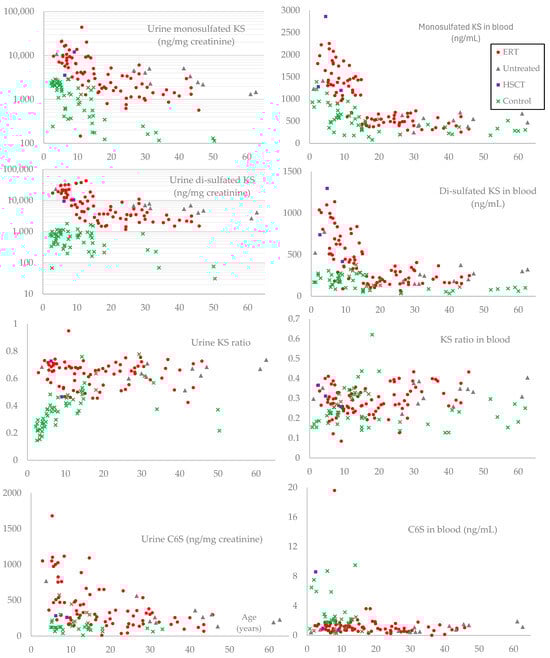 Identifying therapeutic surrogate biomarkers for patients with MPS remains a significant challenge. Characterization of GAGs in urine, blood, and cerebrospinal fluid has been performed for several decades. The previous studies indicated no correlation between urine and serum GAG levels in MPS II and MPS IVA patients []. We found that blood and urine KS levels follow different age-dependent patterns and sulfation levels [,]. Another report in MPS I suggested that the oligosaccharide storage pattern (the ratio of heparan sulfate to dermatan sulfate) in urine reflects the storage in the kidney, which is different from the storage pattern in serum, liver, and brain []. These findings suggest that urinary GAG is derived primarily from GAGs stored or reabsorbed in the kidney. Some urinary GAG may be derived from small GAG fragments (i.e., oligosaccharides rather than a large saccharide chain) that filter through the kidneys from the circulation. Thus, blood GAGs would more closely reflect GAGs stored in the whole body and may be a more informative indicator of systemic disease burden than urinary GAGs.
