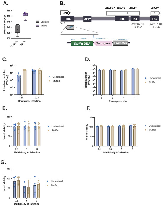 Interestingly, we observed that stuffed nrHSV1 reached improved levels of productivity compared to the undersized nrHSV1. It has been previously shown that herpes virus genome over-lengthening led to spontaneous deletions and altered genome integrity [27]. Similarly, deletion of >15% of the guinea pig cytomegalovirus (GPCMV) wild-type genome length was also shown to lead to partial genome duplication as a compensatory mechanism for the suboptimal genome size [27]. In contrast, GPCMV mutants with larger deletions (13%) exhibited reduced replication efficiency [27]. This decrease was attributed to the loss of key viral genes rather than the reduction in genome size. However, smaller deletions of approximately 10% in both GPCMV and murine cytomegalovirus (MCMV) did not alter viral replication efficiency [27,28], suggesting that such viruses can accommodate variation in genome size up to 10%.