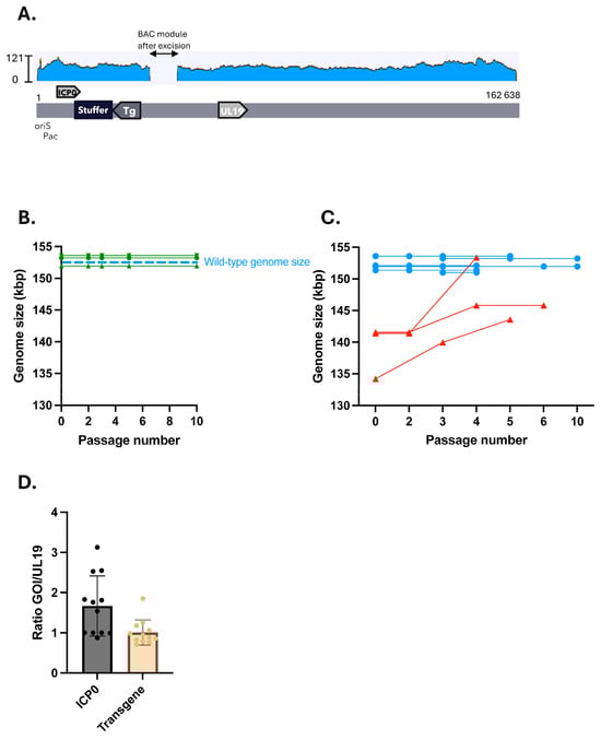 An unbiased comparison of genome size distribution among nrHSV-1 vectors with varying genomic lengths revealed that nrHSV-1 vectors with a genome size smaller than 143 kbp (94% of WT genome) exhibited genomic rearrangements after only two to four passages, indicating poor genomic stability (Figure 2A). In contrast, nrHSV-1 vectors with a genome size of 95% of the wild-type genome (larger than 145 kbp) showed no genomic rearrangements up to 10 passages, suggesting these vectors remained stable over time (Figure 2A). These findings suggest that developing an nrHSV-1 vector with a genome size varying less than 5% from the wild-type is critical to maintaining genomic stability during serial passages.