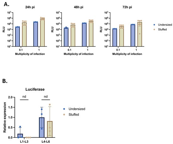To evaluate whether the introduction of the stuffer fragment at the 3′ end of the transgene impacts its expression level, activity, and kinetics, we first monitored the luciferase reporter transgene expression in vitro following the infection of Vero cells with stuffed nrHSV-1 vectors at different multiplicity of infection (MOI) values compared to an undersized counterpart (Figure 4A). We detected comparable luciferase activity between both vector types at 24 h, 48 h, and 72 h post-infection at an identical MOI value (Figure 4A), indicating that both vectors can infect cells and induce robust transgene expression without differences in kinetics, independent of the presence of a stuffer DNA in proximity to the transgene.