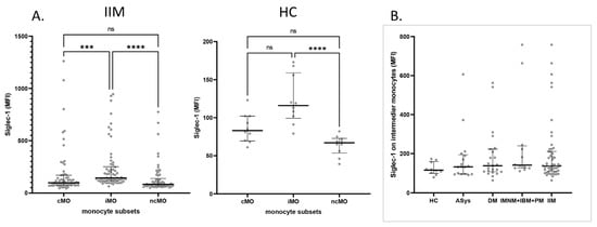 (A) Siglec-1 expression on subsets of monocytes in patients with myositis and healthy controls. Regardless of how active the disease was, intermediate monocytes in the overall IIM group (n = 62) had higher Siglec-1 expression than the classical and non-classical subsets. In the healthy control cohort (n = 10), intermediate monocytes exhibited higher Siglec-1 MFI than non-classical monocytes. Although they also trended above classical monocytes, that difference did not reach statistical significance. (B) Comparison of Siglec-1 expression on intermediate monocytes of subgroups of patients. Data normality was evaluated by the Shapiro–Wilk test. Group differences were analyzed using the Kruskal–Wallis test and, for individual pairwise contrasts, Dunn’s post-hoc test. Sample numbers in each group: HC n = 10; DM n = 33; ASyS n = 17; IMNM/IBM/PM n = 12. Each dot represents the indicated monocyte subset of a single participant. cMO: classical monocytes; iMO: intermediate monocytes; ncMO: non-classical monocytes; MFI: mean fluorescence intensity; IIM: idiopathic inflammatory myopathies; DM: dermatomyositis; ASyS: antisynthetase syndrome; IMNM: immune-mediated necrotizing myopathy; IBM: inclusion body myositis; PM: polymyositis; HC: healthy control; ns: non-significant; ****: p < 0.0001; *** p < 0.001.