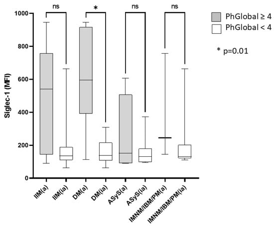 Comparison of Siglec-1 mean fluorescence intensities (MFI) between clinically active and inactive patients. Patients with a Physician Global score equal to or greater than 4 were considered active. Only the DM group showed a statistically significant change in Siglec-1 MFI—note that “IIM” refers to the entire patient population. Data normality was evaluated by the Shapiro–Wilk test. Differences between active and inactive patients were analyzed using the Mann-Whitney test. Sample numbers in each group: DM(a) n = 8, DM(ia) n = 25; ASyS(a) n = 4; ASyS(ia) n = 13; IMNM/IBM/PM(a) n = 3, IMNM/IBM/PM(ia) n = 9. MFI: mean fluorescence intensity; IIM: idiopathic inflammatory myopathies; DM: dermatomyositis; ASyS: antisynthetase syndrome; IMNM: immune-mediated necrotizing myopathy; IBM: inclusion body myositis; PM: polymyositis; ns: non-significant; PhGlobal: Physician Global Activity; a: active; ia: inactive.