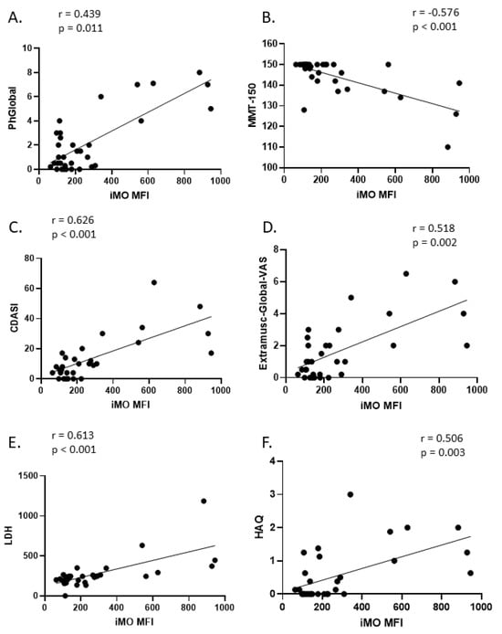Correlation of Siglec-1 MFI values of intermediate monocytes with disease activity parameters of patients with dermatomyositis. (A): Physician Global Disease Activity; (B): Muscle force; (C): Cutaneous Dermatomyositis Disease Area and Severity Index; (D): Extramuscular Global Disease Activity; (E): Lactate Dehydrogenase; (F): Health Assessment Questionnaire. Data normality was evaluated by the Shapiro–Wilk test. Correlations between Siglec-1 MFI values of intermediate monocytes and disease activity parameters were analyzed by calculating Spearman’s correlation. The sample number in the DM group was 33. Each dot represents the data of a single participant. MFI: mean fluorescence intensity; iMO: intermediate monocyte; PhGlobal: Physician Global Activity; MMT-150: Manual Muscle Testing; CDASI: Cutaneous Dermatomyositis Disease Area and Severity Index; Extramusc-Global-VAS: Extramuscular-Global Activity; LDH: lactate dehydrogenase; HAQ: Health Assessment Questionnaire. Values p < 0.05 were considered statistically significant.