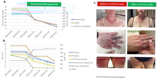 - Shayegan, L.H.; Shaw, K.S.; Wieschhoff, G.G.; Ezeh, N.; Kim, Y.J.; Shahriari, N.; Anshelevich, E.E.; Acevedo, L.A.; LaChance, A.; Dedeoglu, F.; et al. Improvement in Dermatomyositis-Associated Muscle Disease with Anifrolumab. Br. J. Dermatol. 2025, 192, 1126–1128. [Google Scholar] [CrossRef]