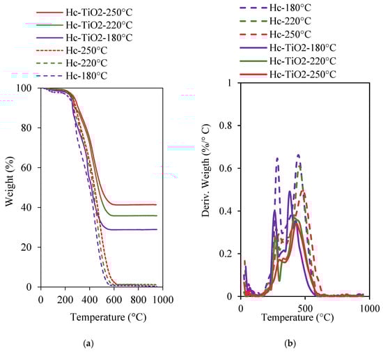 (a) Thermogravimetric analyses (TGA) and (b) derivative thermogravimetric curves (dTGA) for hydrochar and hydrochar–TiO2 composites synthetized at different temperatures. The curves were performed in triplicate (n = 3), and in no case did the statistical errors exceed 5%. The average measurement curve is reported.