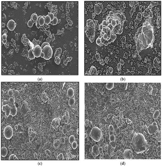 The Hc-TiO2 microstructure was evaluated using FE-SEM. Figure 2a shows spherical assemblies of micrometric order (>1 µm) corresponding to the primary particles of the hydrochar control (Hc). However, the Hc-TiO2 composites in Figure 2b–d show both primary particles of Hc, as well as agglomerates of smaller structures associated with TiO2. Other authors have reported this type of arrangement for carbon–TiO2 systems [,].