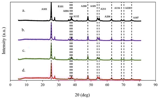 XRD pattern of (a) TiO2, (b) Hc-TiO2-180 °C, (c) Hc-TiO2-220 °C, and (d) Hc-TiO2-250 °C. The curves were calculated in triplicate (n = 3), and in no case did the statistical errors exceed 5%. The average measurement curve is reported.
