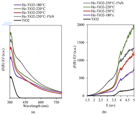 Diffuse reflectance spectra of TiO2, Hc-TiO2-180 °C, Hc-TiO2-220 °C, Hc-TiO2-250 °C and Hc-TiO2-250 °C-1%N based on (a) light absorption wavelengths and (b) energy expressed in electron volts. The curves were performed in triplicate (n = 3), and in no case did the statistical errors exceed 5%. The average measurement curve is reported.