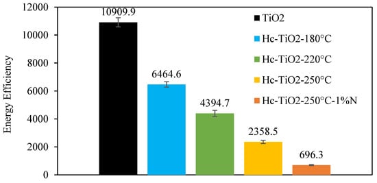 Figure 5 presents the energy efficiency (EEO) quantification for the photodegradation of MO under visible light using TiO2 and as-prepared Hc-TiO2.
